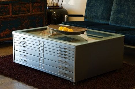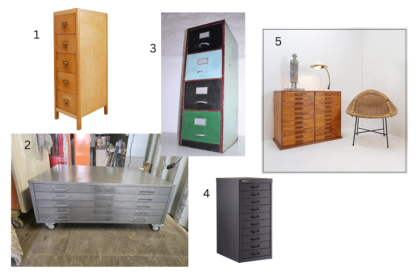 1. Vintage industrial 5-drawer filing cabinet, 2. Vintage steel Flat File Coffee Table Medium Made to Order, 3. Unusual Industrial Salvage Colourful Office Metal Filing Cabinet, 4. 10 Drawer Cabinet, 5. Vintage handmade 22 Drawer Wooden Flat File Cabinet