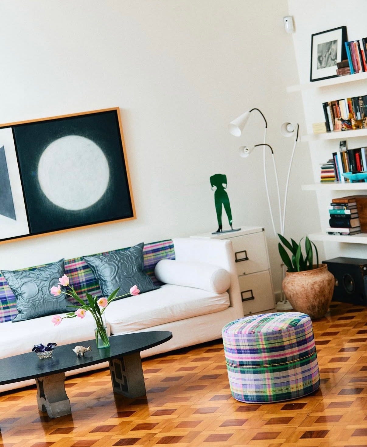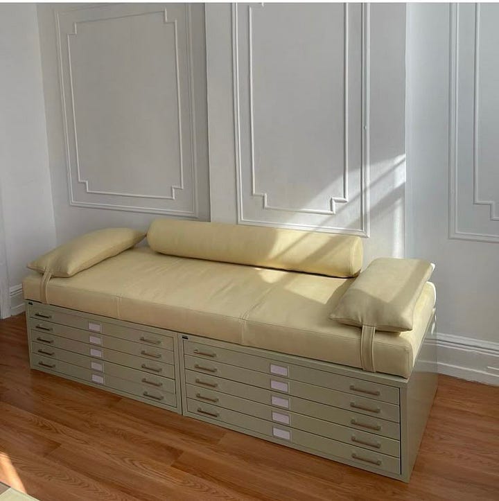 The leather daybed perched on a base of metal file cabinets was the thing that sent me down this rabbit hole. It looks like something that belongs in an architect’s office, yet somehow feels completely at home in a living space.